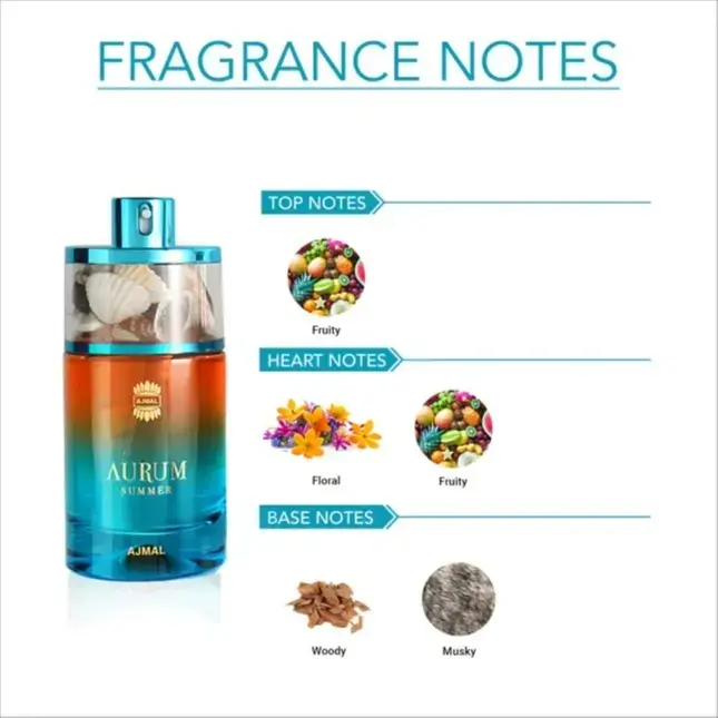 Sun kissed with fruity and floral summer notes like lemon, raspberry, orange blossom, gardenia and jasmine and embraced with woody and musky notes of amber, musk and vanilla, the golden allure of aurum adds the touch of midas to any occasion.