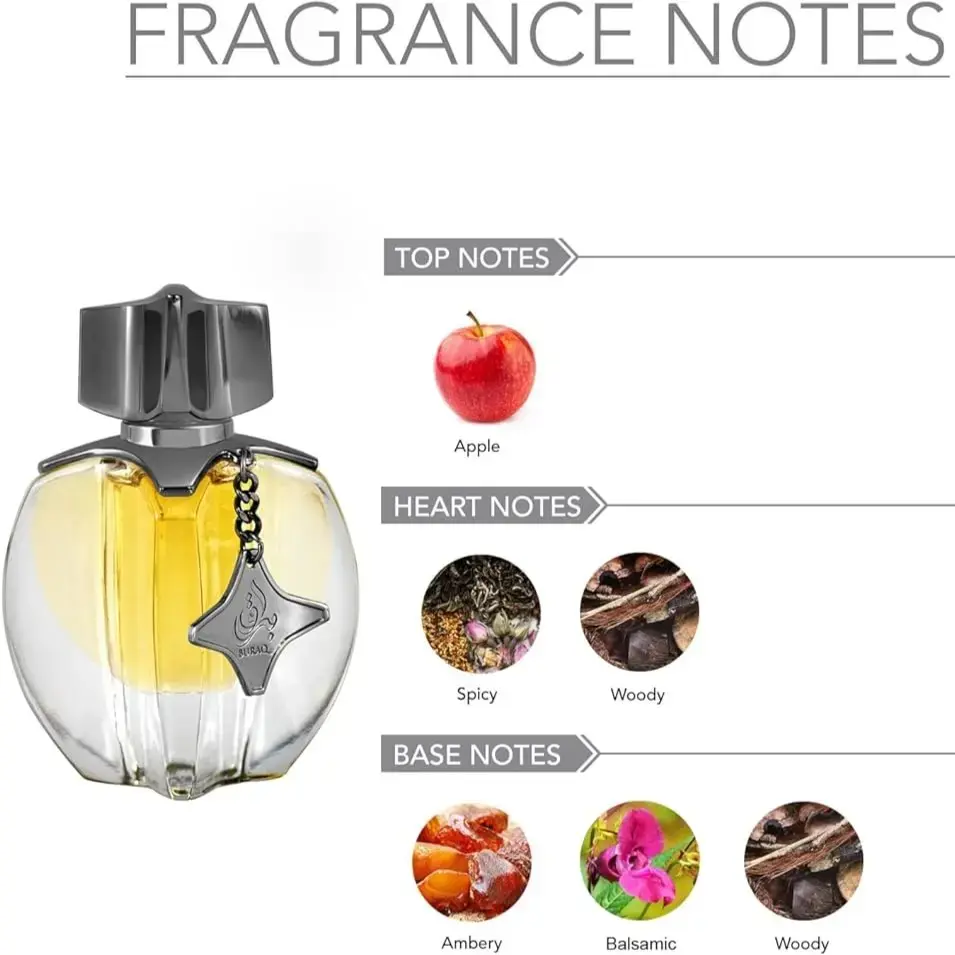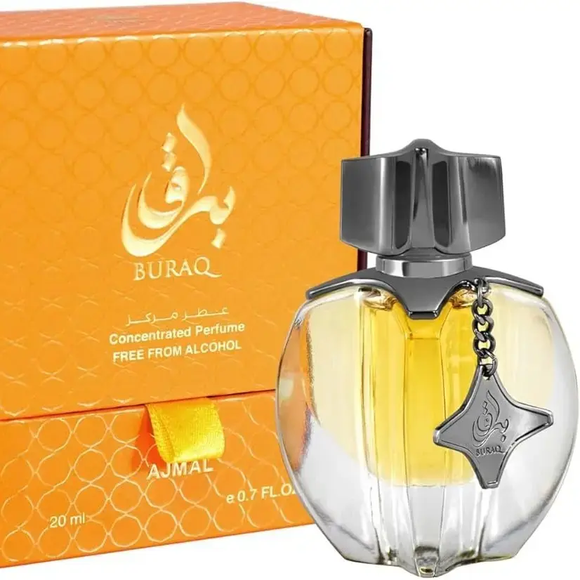 Ajmal Buraq Attar is a unisex, non-alcoholic, long-lasting perfume that combines the intensity of precious woods with warm amber notes. It has a fruity top note, a spicy and woody middle note, and an amber and balsamic base note. The top note is fruity, with notes of apple. The middle note is spicy and woody, with notes of cinnamon, saffron, and clove. The base note is amber and balsamic, with notes of amber, labdanum, and cypriol.