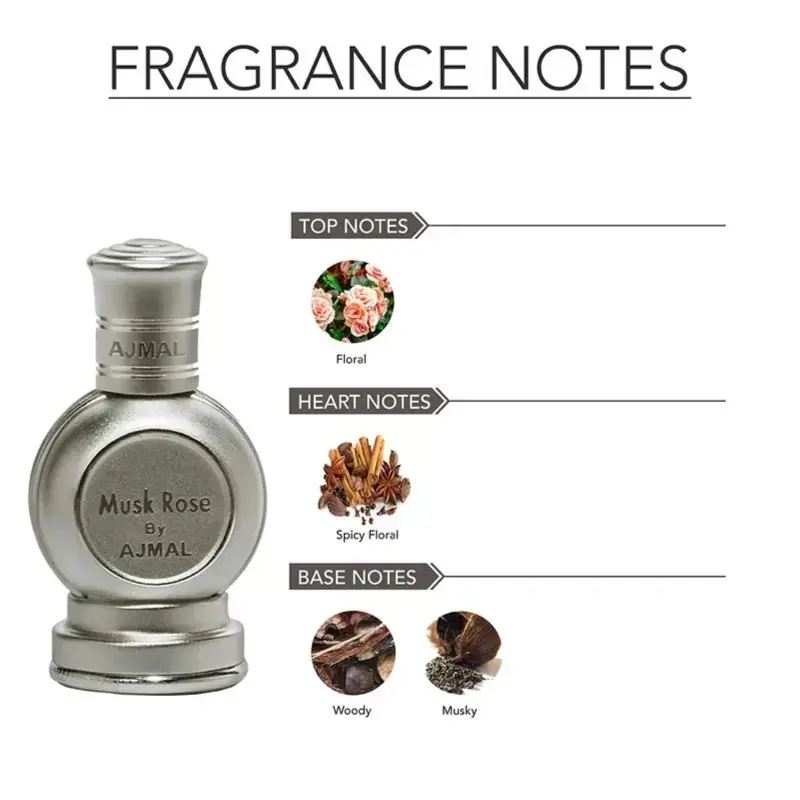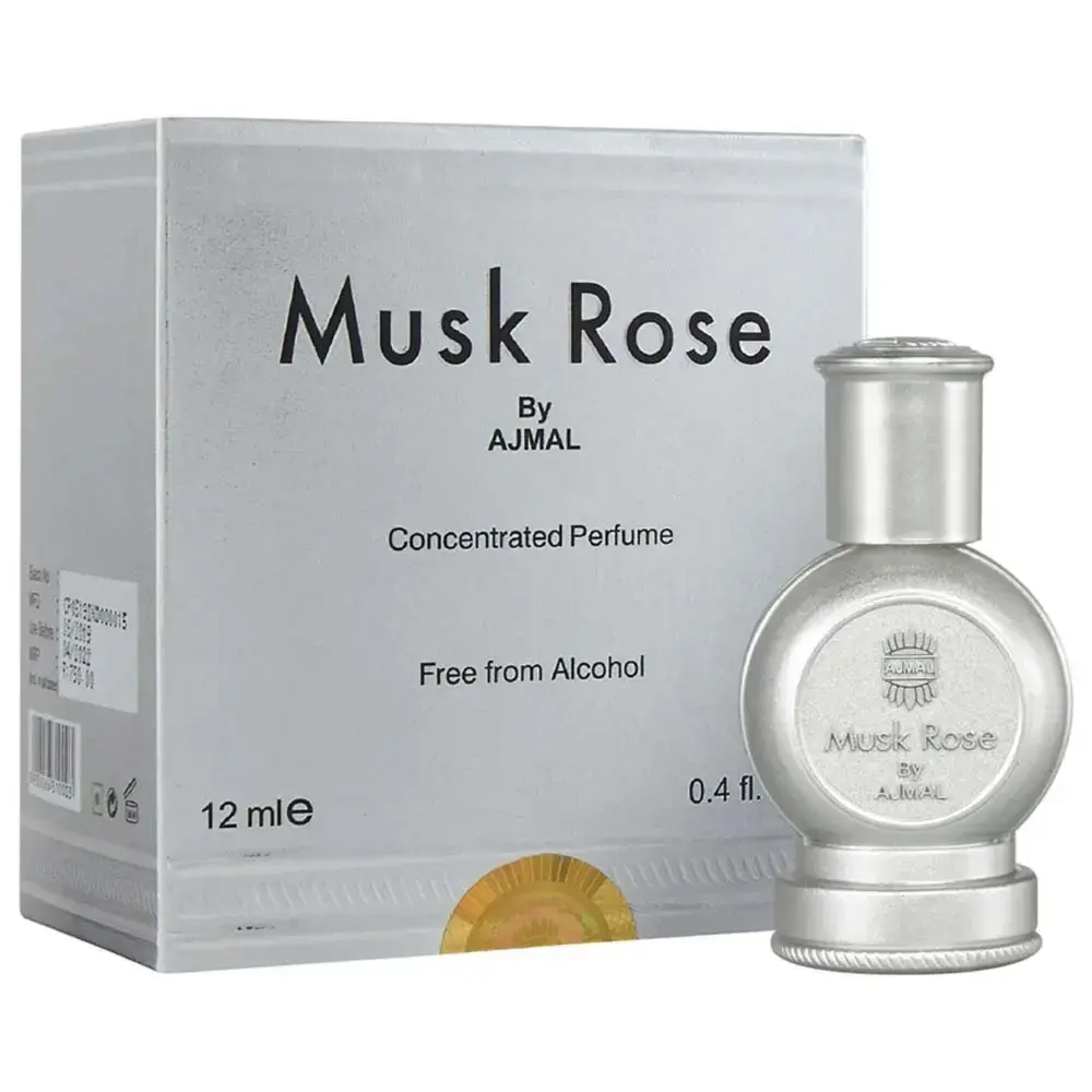 Ajmal Musk Rose Attar is a unisex, alcohol-free, concentrated, floral perfume oil with top notes of rose, middle notes of jasmine, and base notes of white musk. The fragrance is described as a modern oriental blend that’s long-lasting, exotic, and high-quality. It has a noticeable and unforgettable scent that opens with pure rose and then jasmine, and ends with warm musky and floral notes.